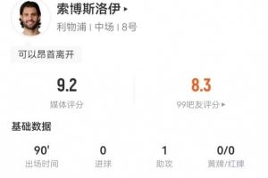 索博本场1助攻+8成功长传 4解围6抢断+15对抗11成功 获9.2分最高