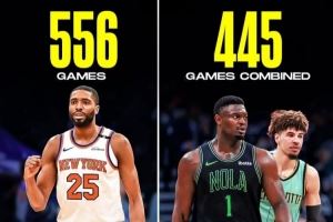 美媒Clutchpoints晒图,布里奇斯生涯出场556次,锡安和三球加起来445次。