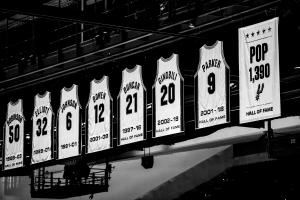马刺主场上空拉起旗帜致敬波波维奇 标有1390的历史第一胜场