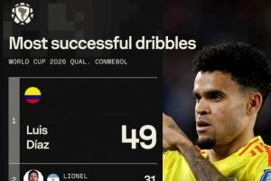 本届南美世预赛成功过人榜:迪亚斯49次居首,梅西31次第二